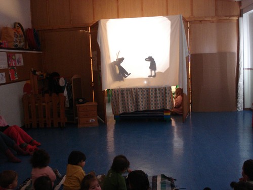 Então...toca de construir os fantoches, ler e ensaiar a história e,...no dia combinado e com convites enviados aos meninos das outras salas, apresentámos o espectáculo.