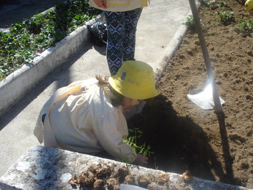 Depois da terra bem arranjada começámos a colocar os rebentos nas covinhas que a Micaela e a Sónia íam fazendo.